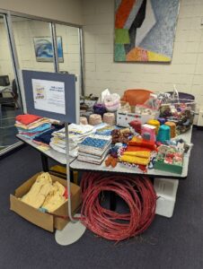 A Blugold Makerspace classic that will be moved from the library to the Repair Fair for one day only is our famous Craft Swap. Try something new, but it wasn’t for you? Donate the supplies to the Craft Swap! We are always collecting fabric, coloring supplies, yarn, canvases, and more for the Blugold Makerspace, but anything we can’t keep for whatever reason, we supply for our library users during our regular open hours. You may find your new favorite hobby! Donations are not required to take an item, but they are encouraged. Because the Craft Swap works on an honor system, we do get some interesting donations (or, donations arranged in interesting ways – we see you, felt letters). Besides yarn, fabric, etc., we collect things you wouldn’t expect. Some of the more popular donations are recycled tri-fold poster boards for presentations, half completed art projects, puzzles missing pieces, or a really, really good box. Having the Swap connected with the Makerspace has also helped many of our students who face financial hardship the ability to continue their class projects or use materials to repair something they own!